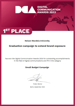 Nelson Mandela University won a Gold Digital Communication Award for outstanding accomplishments in the field of digital communications and PR in the category Small Budget Campaign for its "Graduation campaign to extend brand exposure".