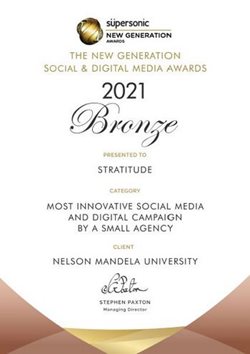 Presented to Stratitude in the category Most Innovative Social Media and Digital Campaign by a Small Agency for the client, Nelson Mandela University.